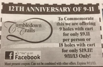 Golf Course: A Wisconsin golf course joined many other companies in providing 9/11 discounts. The golf course discounted 9 holes of golf with a cart for $9.11 or 18 holes with a cart for $19.11 on Wednesday.