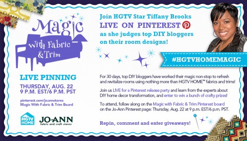 Join Jo-Ann Fabric and Craft Stores, HGTV, special guest Tiffany Brooks and four leading bloggers for an online Pinterest party TONIGHT as bloggers unveil their stunning final room designs for the Magic With Fabric & Trim competition.